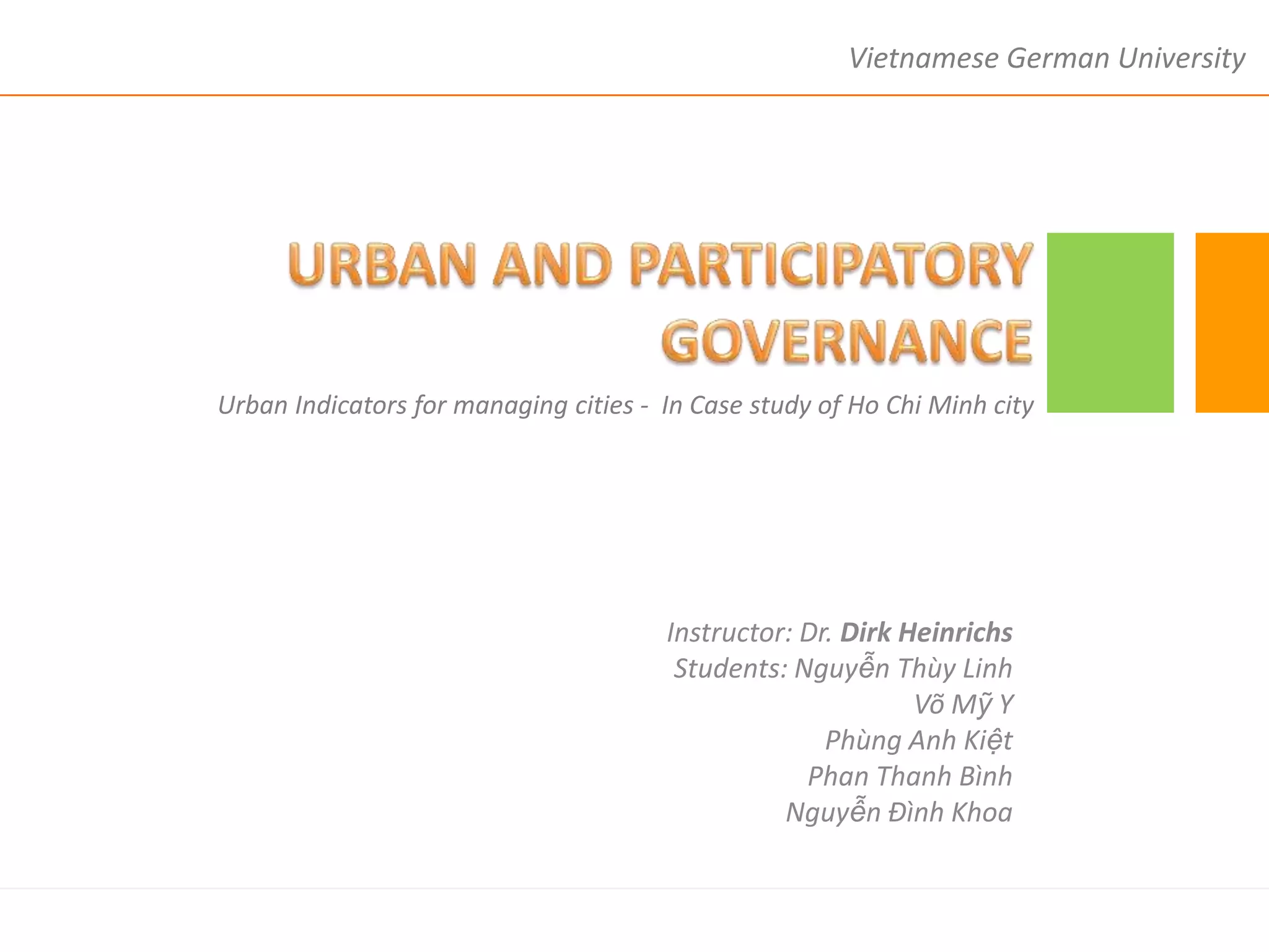 The document discusses urban indicators for managing cities in Ho Chi Minh City proposed by the Asian Development Bank. It outlines the 140 indicators grouped into 13 categories measuring governance. The indicators' usefulness is judged based on validity, reliability and representativeness for Ho Chi Minh City. Five relevant indicators are selected and why they are appropriate, and how and where to find the necessary data is described. The performance of indicators and benchmarking are said to be necessary to effectively measure governance.