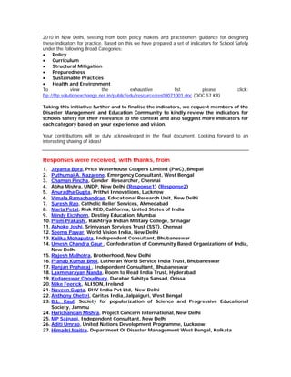 Members provided extensive feedback on the indicators for school safety being developed by SEEDS India. Overall, members agreed the indicators were comprehensive but provided recommendations to strengthen certain areas. Key recommendations included: ensuring gender sensitivity by including indicators that address the specific needs of girls/women; reflecting psychological aspects of school safety; and restricting some policy-level indicators to the role of schools, rather than broader government responsibilities. Members also recommended additions and rewording of specific indicators, particularly around structural safety, preparedness, and sustainable practices. The discussion highlighted the importance of developing school safety policies at the state level to provide an overall framework, within which schools can operate locally.