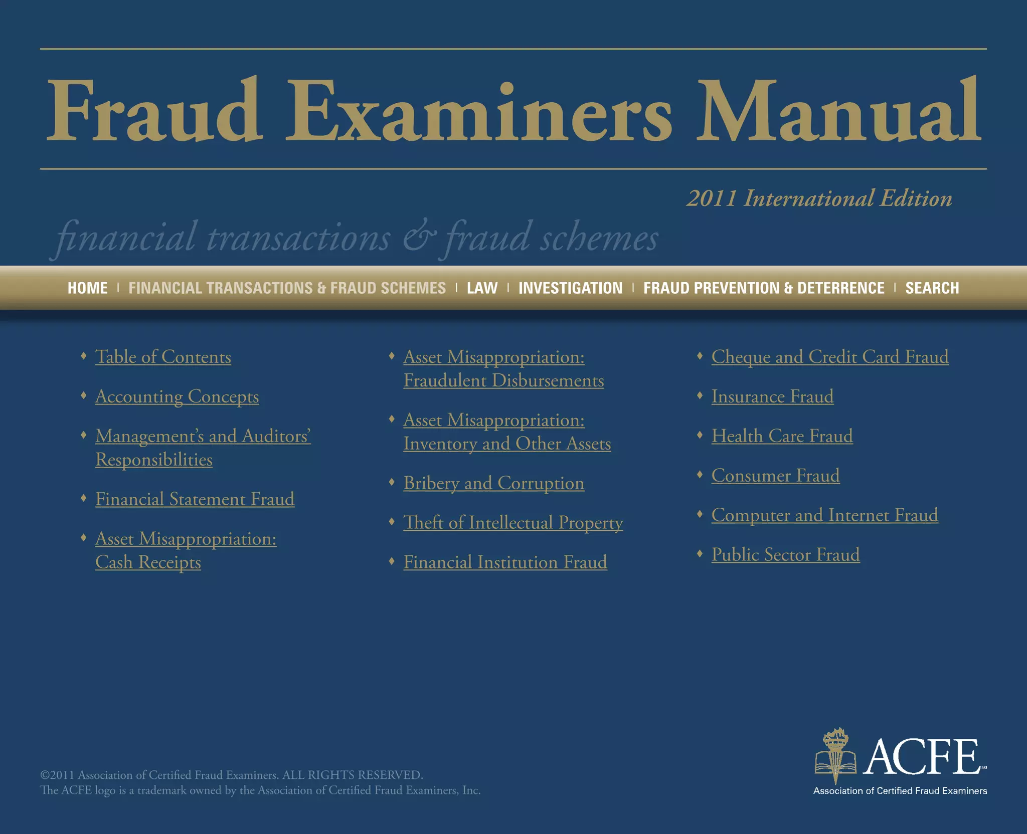 The 2011 International Edition of the Fraud Examiners Manual provides comprehensive guidance on various aspects of fraud detection, prevention, and investigation, covering financial transactions, legal frameworks, and ethics for fraud examiners. It includes detailed sections on asset misappropriation, financial statement fraud, and specific schemes like cheque tampering and billing schemes. The manual aims to equip fraud examiners with the necessary tools and knowledge to effectively address and mitigate fraud risks.