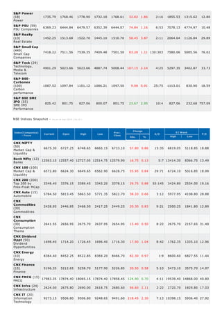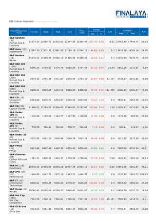 The document provides a snapshot of various Indian stock market indices as of April 16, 2014. It lists the name of each index along with the number of companies it represents, the current value, high and low for the day, previous closing value, change from previous close, and other metrics like P/E ratio and number of advancing and declining stocks. The indices shown include S&P BSE Sensex, Nifty 50, Bank Nifty, and various sectoral indices tracking automobiles, banks, capital goods, FMCG, healthcare, information technology, metals, oil & gas, and other industries.