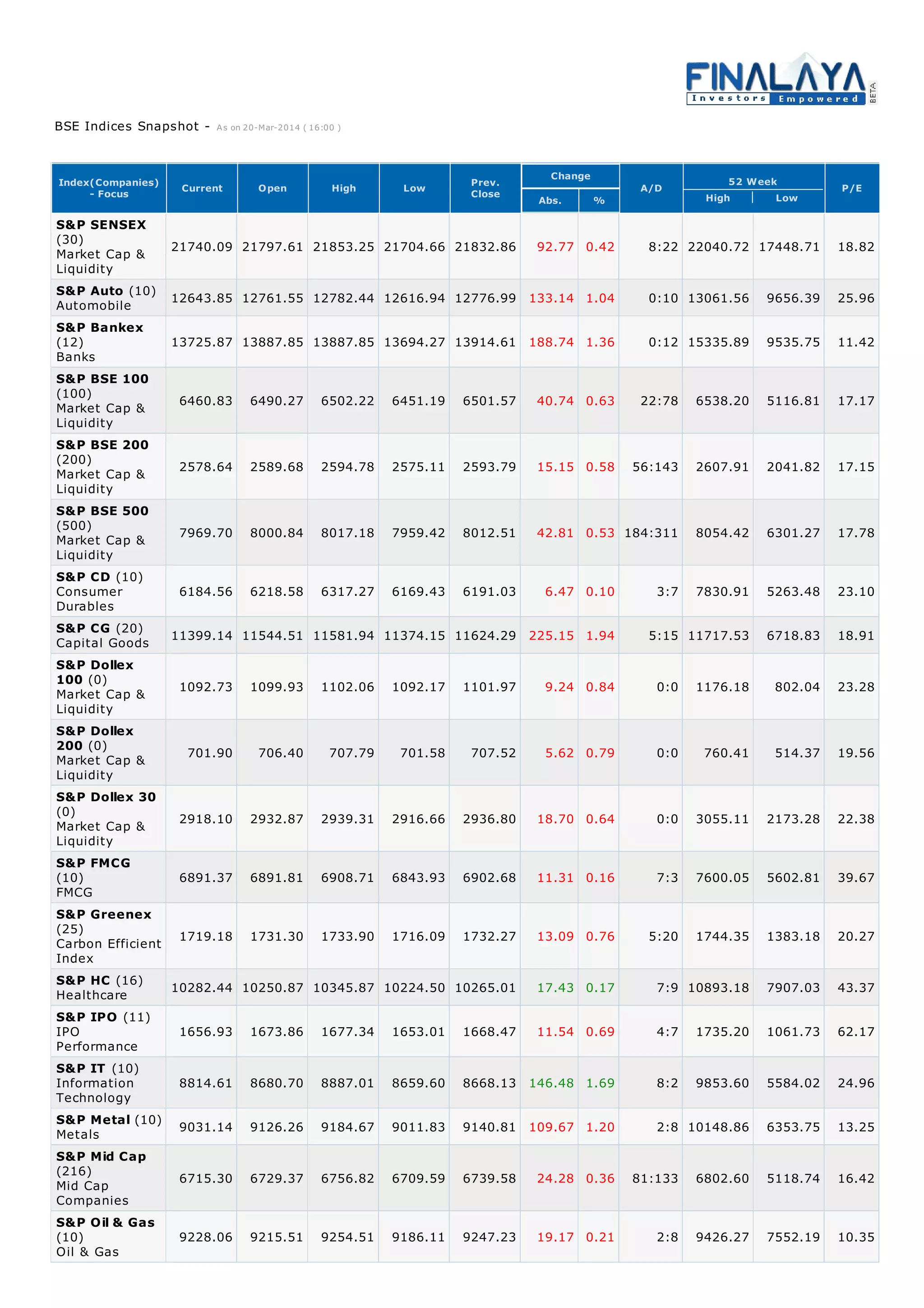 The document provides snapshots of various Indian stock market indices as of March 20, 2014, including the S&P BSE SENSEX, Nifty 50, Bank Nifty, and other sector-specific indices. It lists the current value, day's high and low, previous closing value, and change for each index. The snapshots also include other data like the number of companies in each index, price-to-earnings ratio, and average daily trading volume.