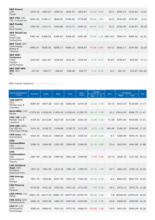 The document provides a snapshot of various BSE and NSE stock market indices in India as of December 23, 2013. It lists the name of each index along with the number of companies included, its sectoral focus, current index value, day's high and low, previous day's close, change in points and percentage from previous close, and 52-week high and low for each index. The indices cover various sectors of the Indian economy including autos, banks, IT, metals, oil & gas, real estate, and small caps.