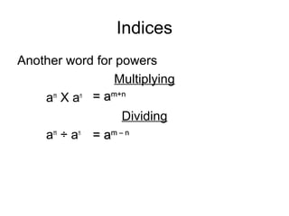 This document provides examples and rules for performing operations with indices and fractional indices. It explains that multiplying terms keeps the base and adds the indices, dividing terms keeps the base and subtracts the indices. Negative indices result in the reciprocal of the base to the power of the absolute value of the index. Fractional indices mean the root is on the bottom and the top number is the power. It also gives examples like square root problems can be written as indices of one-half and provides practice problems for the reader to try.