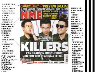 This document summarizes the design elements of several indie music magazines. It notes that the magazines use bright colors, bold titles, and large images to attract attention. They include information on music festivals and concerts that readers would be interested in. Captions and article text are typically in all capital letters to give an exciting, loud feel. The magazines also advertise ticket giveaways and free posters to promote interest in the publication and bands featured. Overall the design aims to stand out from other magazines and attract indie music fans through eye-catching visuals and relevant content.