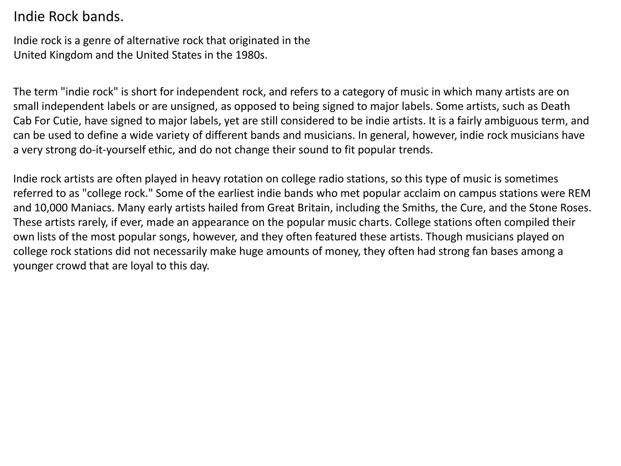The document discusses the genre of indie rock music. It originated in the UK and US in the 1980s and refers to alternative rock artists that are typically signed to independent labels rather than major labels. While some indie artists have signed to major labels, they maintain an independent spirit and do not conform to popular trends. College radio stations helped popularize early indie artists like R.E.M. and The Cure. Though indie artists may not achieve large commercial success, they often have dedicated cult followings.