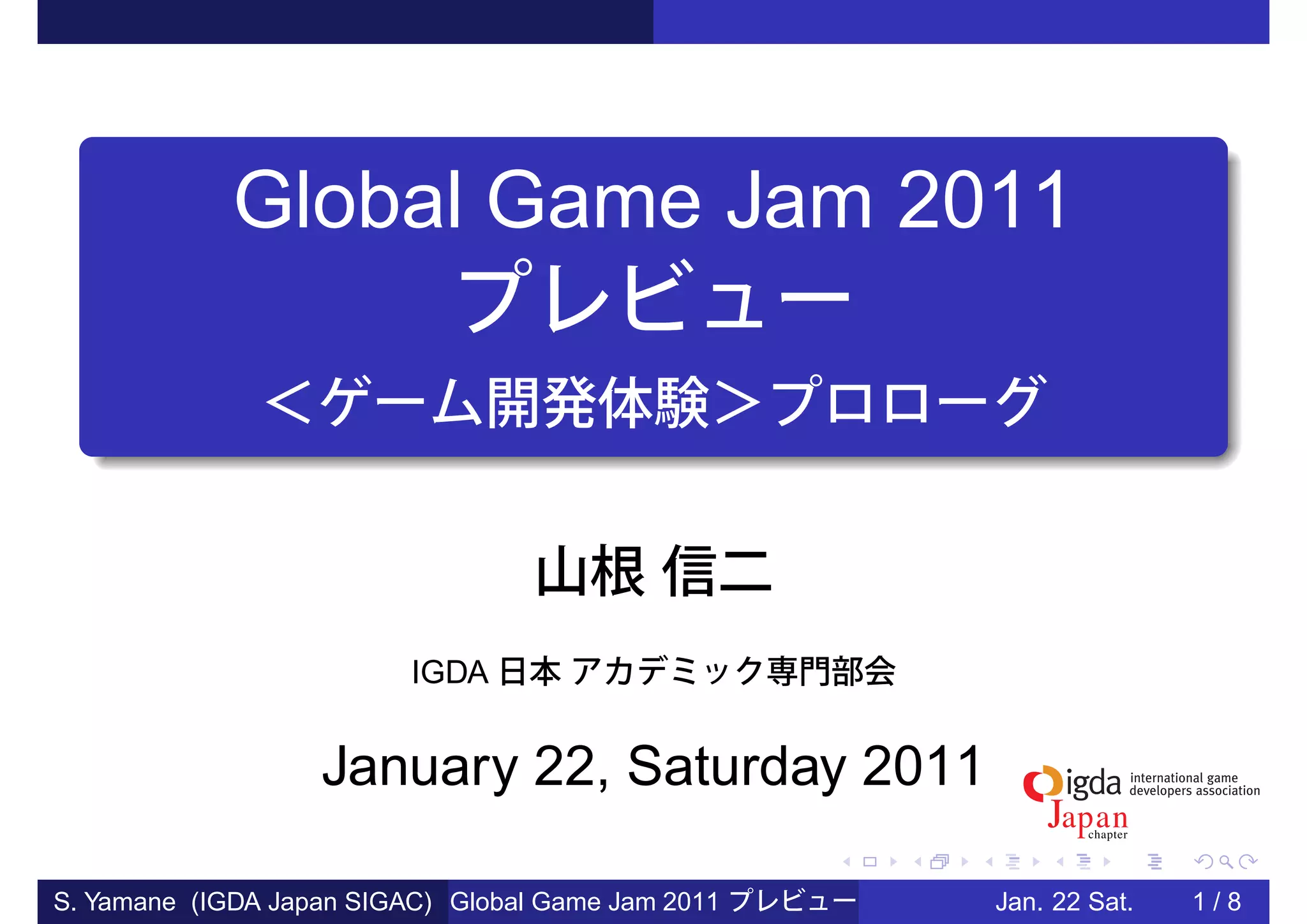 The document discusses the Global Game Jam 2011 event organized by the International Game Developers Association (IGDA). The Global Game Jam is an international game jam where game developers come together over a weekend to create games. In 2011, over 173 sites across 44 countries participated, with over 300 total participants. The IGDA is an international non-profit organization that supports game developers.