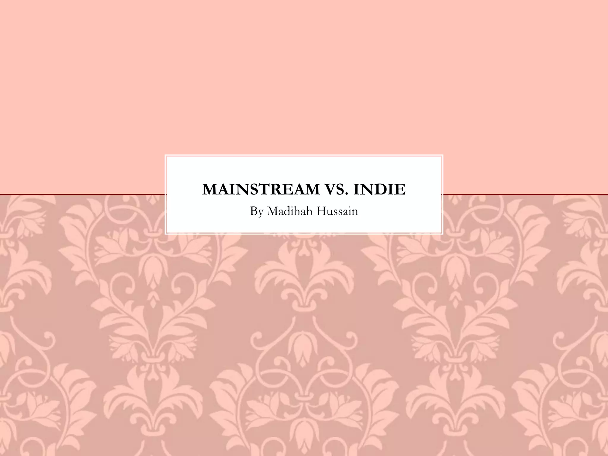 The document compares mainstream and indie artists, using One Direction and Lanterns on the Lake as examples. One Direction is signed to major labels Syco Music and Columbia Records, has a large teenage/girl fanbase, and extensive merchandise. They gained fame through X Factor and have significant marketing support. In contrast, Lanterns on the Lake is signed to the independent label Bella Union, has a smaller audience, limited merchandise, and became known through smaller gigs and music videos rather than a major reality show. The document outlines advantages and disadvantages of major labels like widespread promotion but less artistic freedom, versus independence but smaller audiences and budgets.