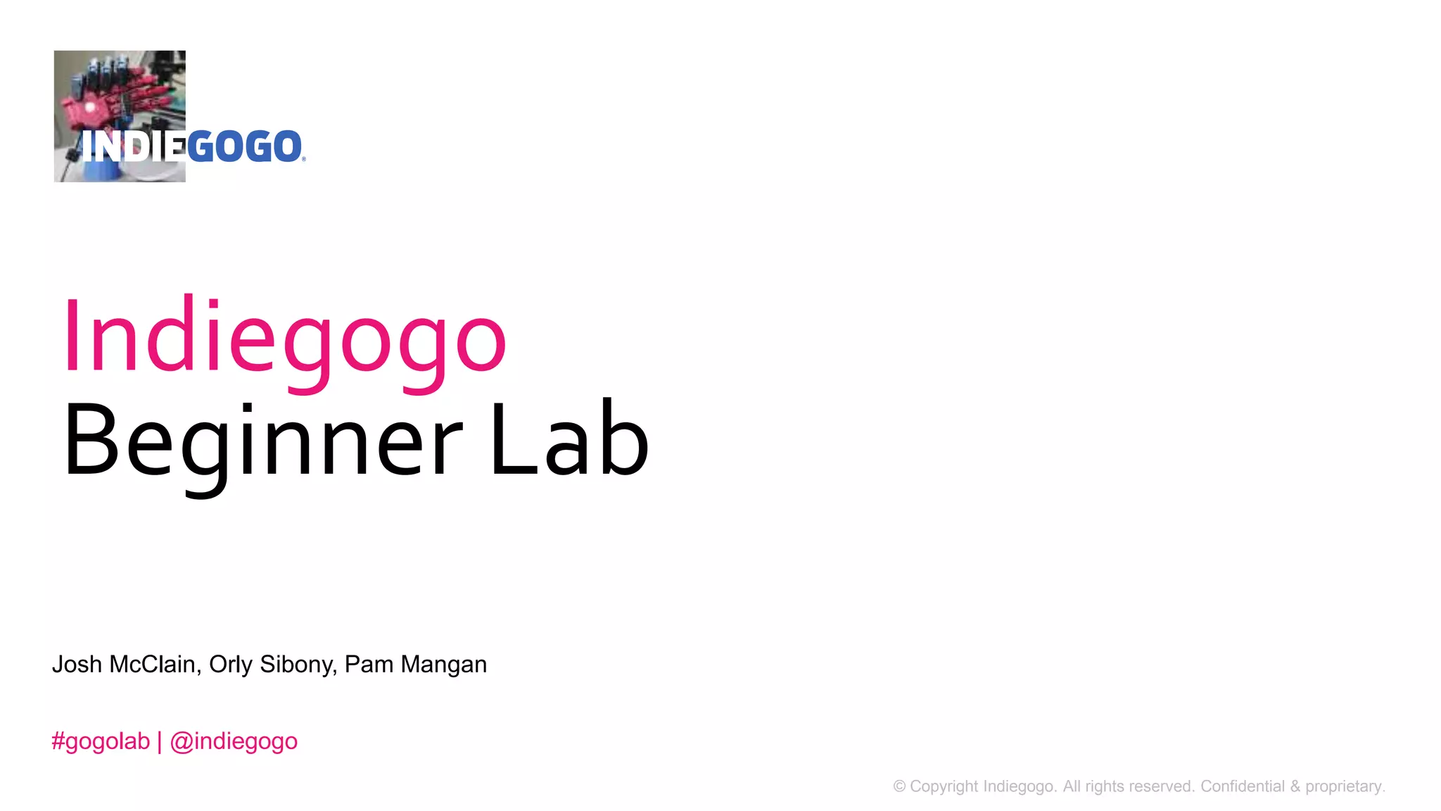 The document outlines an Indiegogo Lab presentation on crowdfunding best practices. The agenda includes sections on pitching a campaign, creating perks, and promoting a campaign. Key tips discussed are planning the pitch video and text to tell a compelling story, creating perks that motivate contributions, building support networks before launch, and maintaining active engagement during the campaign through emails, social media, and events. The goal is to help campaigns raise funds and connect with audiences on Indiegogo's flexible crowdfunding platform.