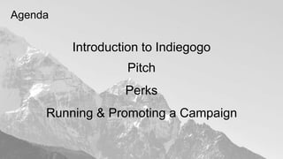 The document provides an overview of Indiegogo and how to run a successful crowdfunding campaign on their platform. It discusses pitching a project with a goal, video, and text pitch. It also covers creating perks to motivate contributions and fulfilling those perks. The document advises planning pre-launch by building supporter teams and securing initial funding. It offers tips for launching, promoting, and actively engaging with supporters during a campaign.