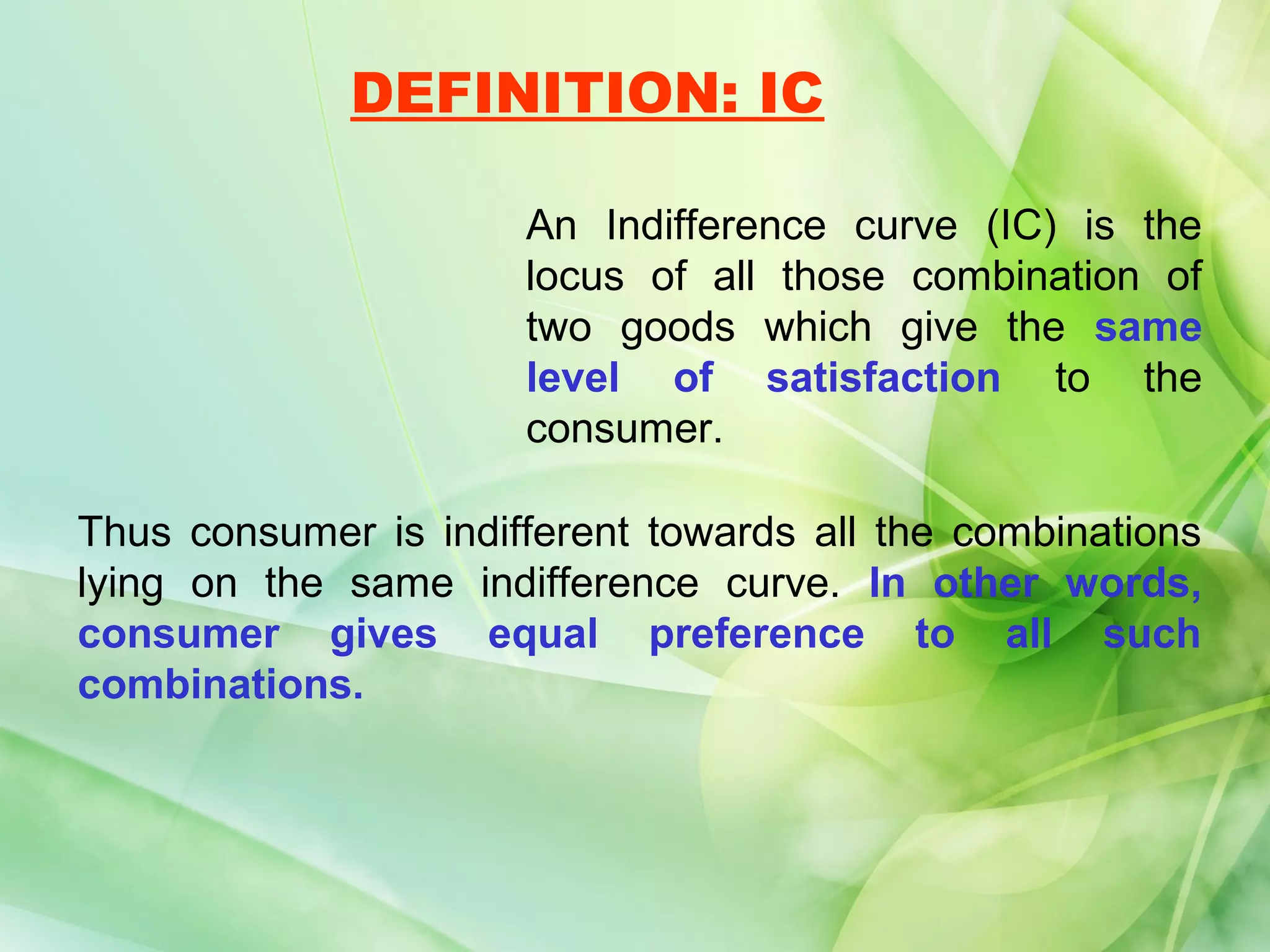 An indifference curve represents combinations of two goods that provide equal satisfaction to a consumer. It has a negative slope and is convex, meaning that the marginal rate of substitution diminishes as consumption increases along the curve. The slope of the indifference curve represents the rate at which a consumer is willing to substitute one good for another to maintain the same satisfaction level.