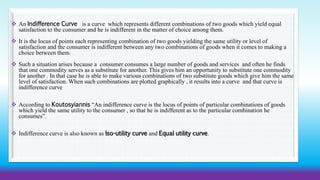 An indifference curve represents combinations of two goods that provide equal satisfaction to a consumer, making them indifferent between choices. It is a locus of points where the consumer is indifferent between combinations that yield the same utility. Indifference curves have negative slopes and are convex, with higher curves representing greater satisfaction. They do not intersect or touch each other, the axes, or have parallel curves. Indifference schedules in tables and indifference maps with multiple curves represent preferences graphically.