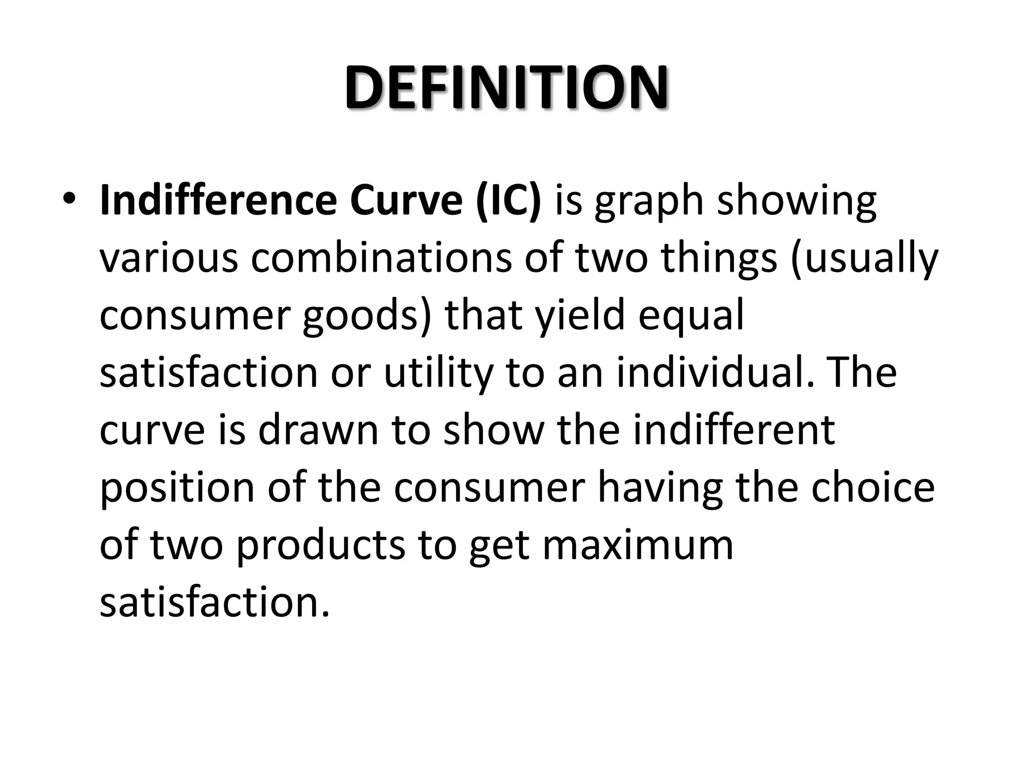 The document defines indifference curves as graphs showing combinations of two goods that provide equal satisfaction to a consumer. Indifference curves are convex and the marginal rate of substitution diminishes along the curve. The budget line shows affordable combinations given prices and income. At the point where the budget line is tangent to the highest indifference curve is the consumer's equilibrium. Price, income, and substitution effects cause the curve to shift as prices or income change.