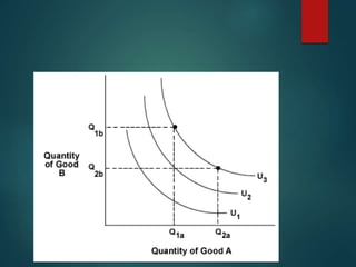 The document presents key concepts of indifference curves and their assumptions related to consumer behavior, including rationality, utility, and the diminishing marginal rate of substitution. It highlights properties such as the negative slope, convexity, and the inability of curves to intersect. Additionally, it explains the consumer equilibrium condition at the tangency between the indifference curve and the budget line.