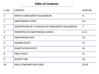 This document provides an overview of indifference curve analysis for consumer equilibrium. It discusses key concepts such as indifference curves, their properties, assumptions of indifference curve analysis, indifference maps, budget lines, price and income effects, derivation of demand curves, isoquants, iso-cost curves, short-run and long-run costs. The document contains definitions and explanations of these microeconomics concepts as well as examples and diagrams to illustrate them. It is intended as a reference for understanding consumer choice theory and producer theory using indifference curve and isoquant analysis.