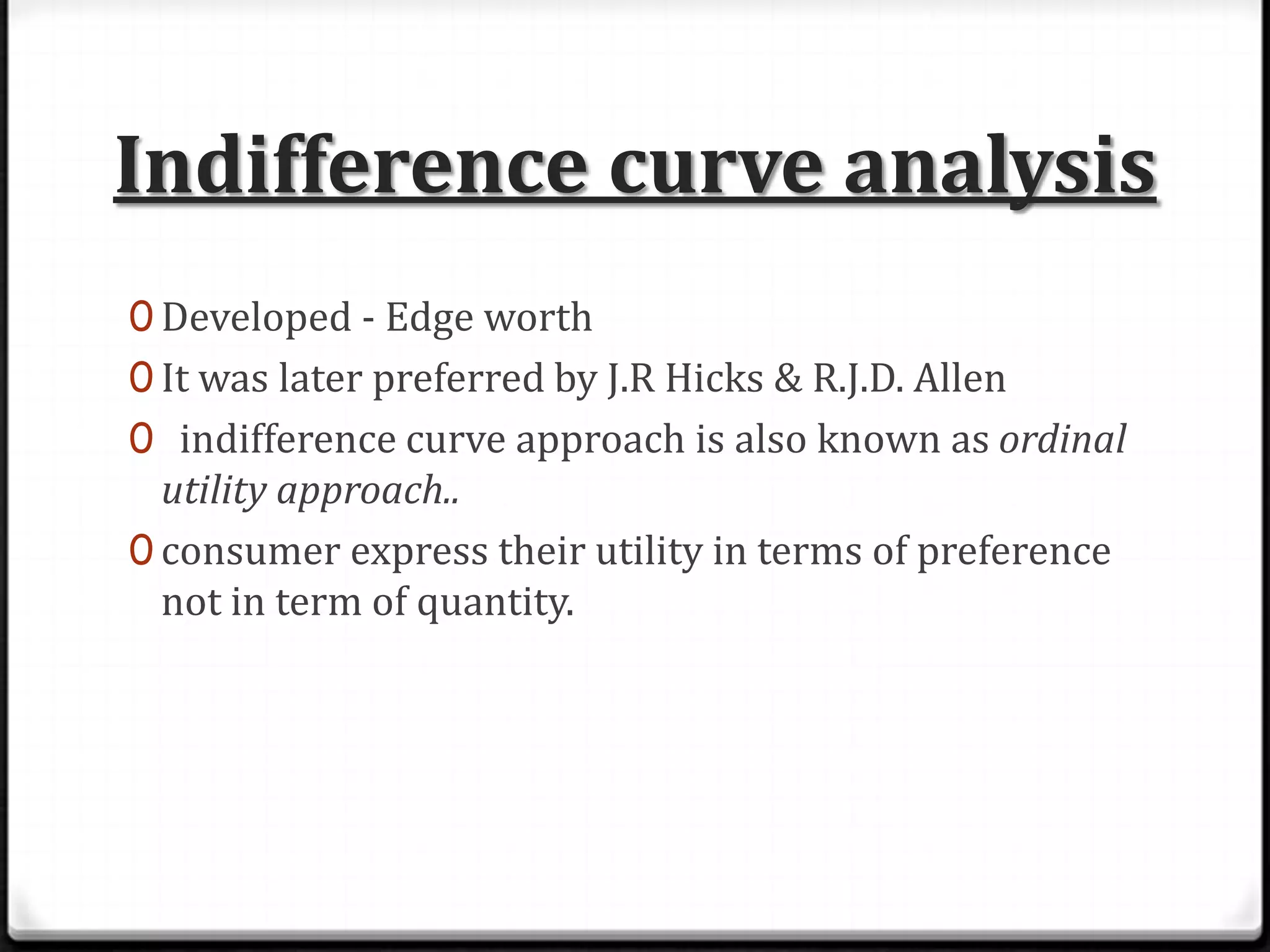 This document discusses indifference curve analysis, which is an approach to consumer choice developed by Edgeworth and later preferred by Hicks and Allen. It assumes consumers express preferences over bundles of goods rather than quantities. Consumers are assumed to be rational and choose the bundle that provides the highest satisfaction level. An indifference curve represents combinations of two goods that provide equal satisfaction. The document provides an example indifference schedule and shows how it can be represented graphically with indifference curves, with higher curves indicating greater satisfaction.