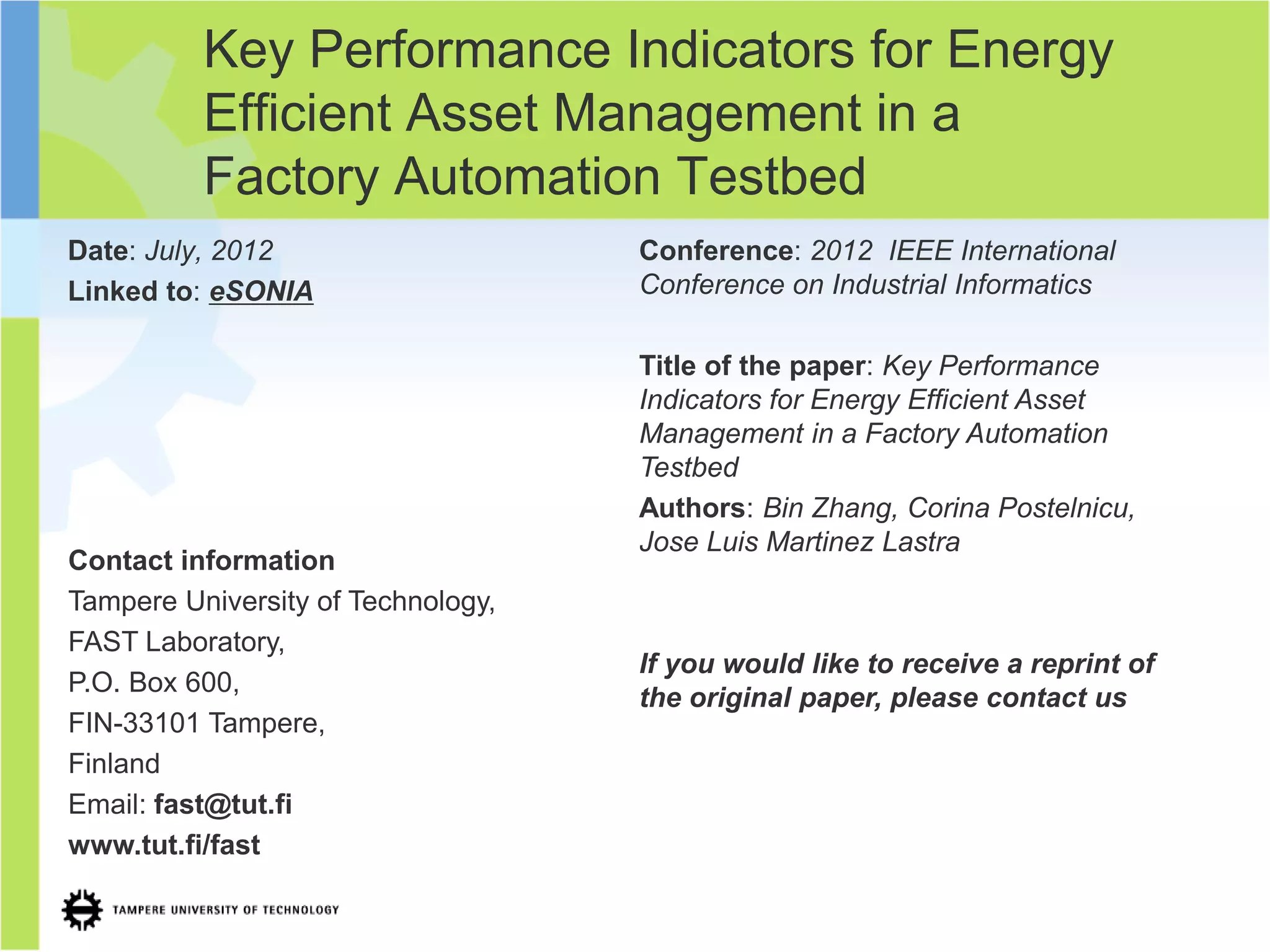 The document presents key performance indicators (KPIs) for energy-efficient asset management in a factory automation testbed, developed by researchers from Tampere University of Technology. It outlines the testbed setup, defines KPIs, and discusses the use of an event processing language for real-time data management and retrieval. Future work involves setting performance targets and developing alarm mechanisms for monitoring KPI thresholds.