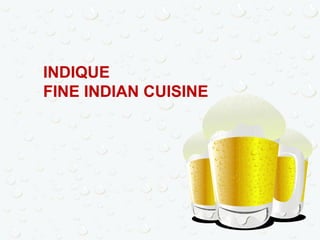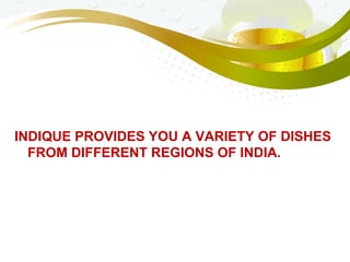 Indique provides an authentic Indian fine dining experience with dishes from various regions of India. The restaurant offers both vegetarian and non-vegetarian appetizers, tandoori delights, dosa, and main courses featuring chicken and vegetarian options. Indian cuisine is recognized for its sophisticated use of spices and herbs, and Indique serves a wide variety of foods from mild to spicy and vegetarian to seafood.