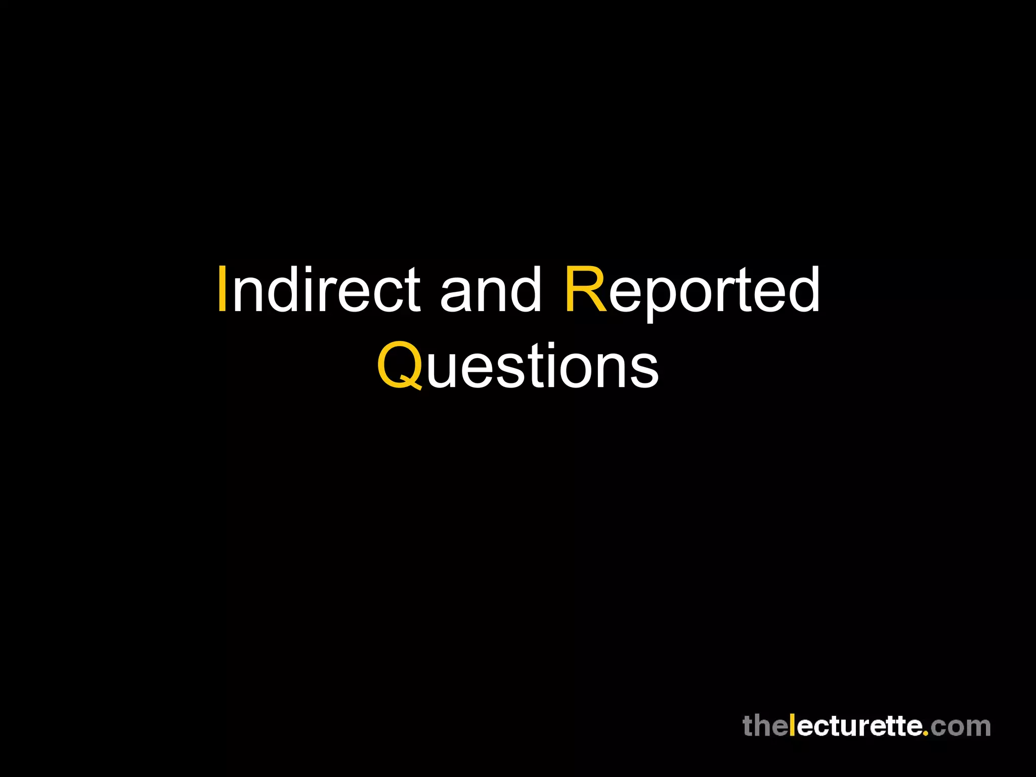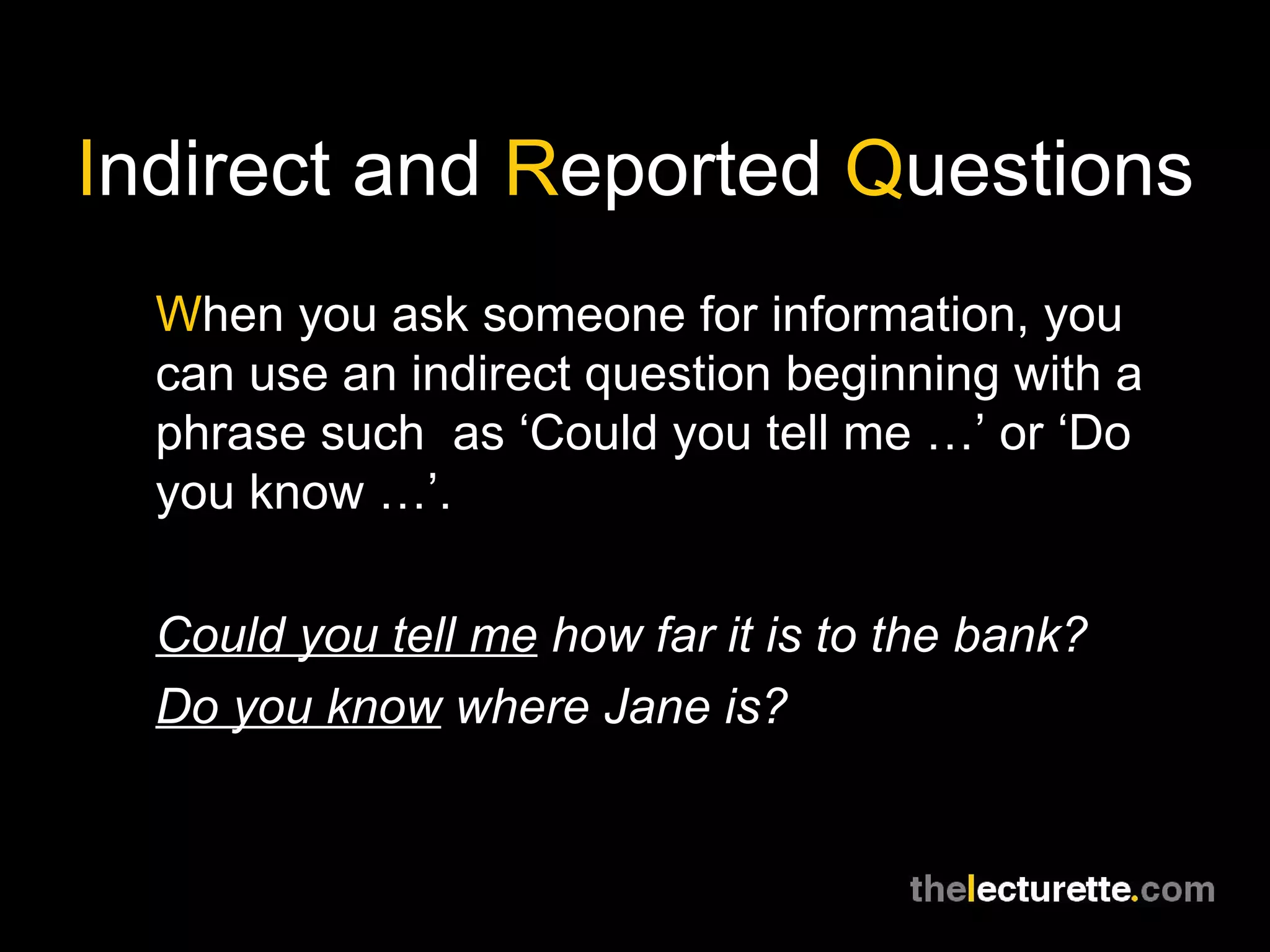 The document explains the use of indirect and reported questions in English, including how to phrase polite inquiries and the structure differences compared to direct questions. It highlights the importance of auxiliary verbs and the use of 'if' or 'whether' in introducing yes/no questions. Additionally, it notes that reported questions often use past tense unless discussing present or future situations.