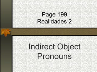 This document discusses indirect object pronouns in Spanish. It explains that indirect object pronouns indicate to whom or for whom an action is performed. It provides examples of indirect object pronouns like "me", "te", "le", "nos", and "les" and explains that they can be placed before conjugated verbs or attached to infinitives. It also discusses using indirect object pronouns with verbs like "gustar" and "encantar".