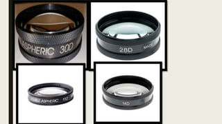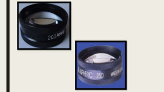 3. Use a 20D lens for general exams and a 30D lens initially for the ora serrata. Hold lenses correctly and focus by moving them in and out.
