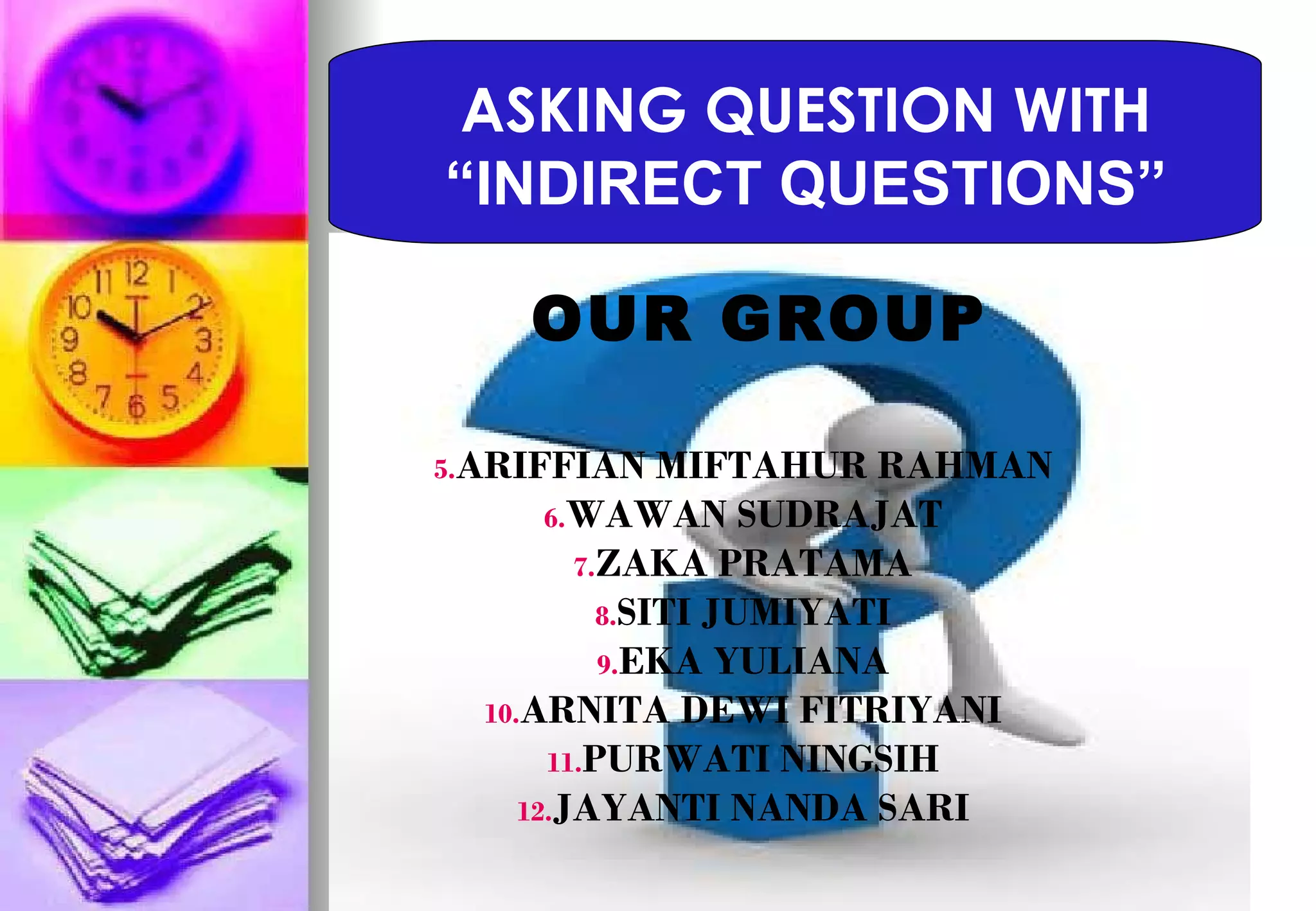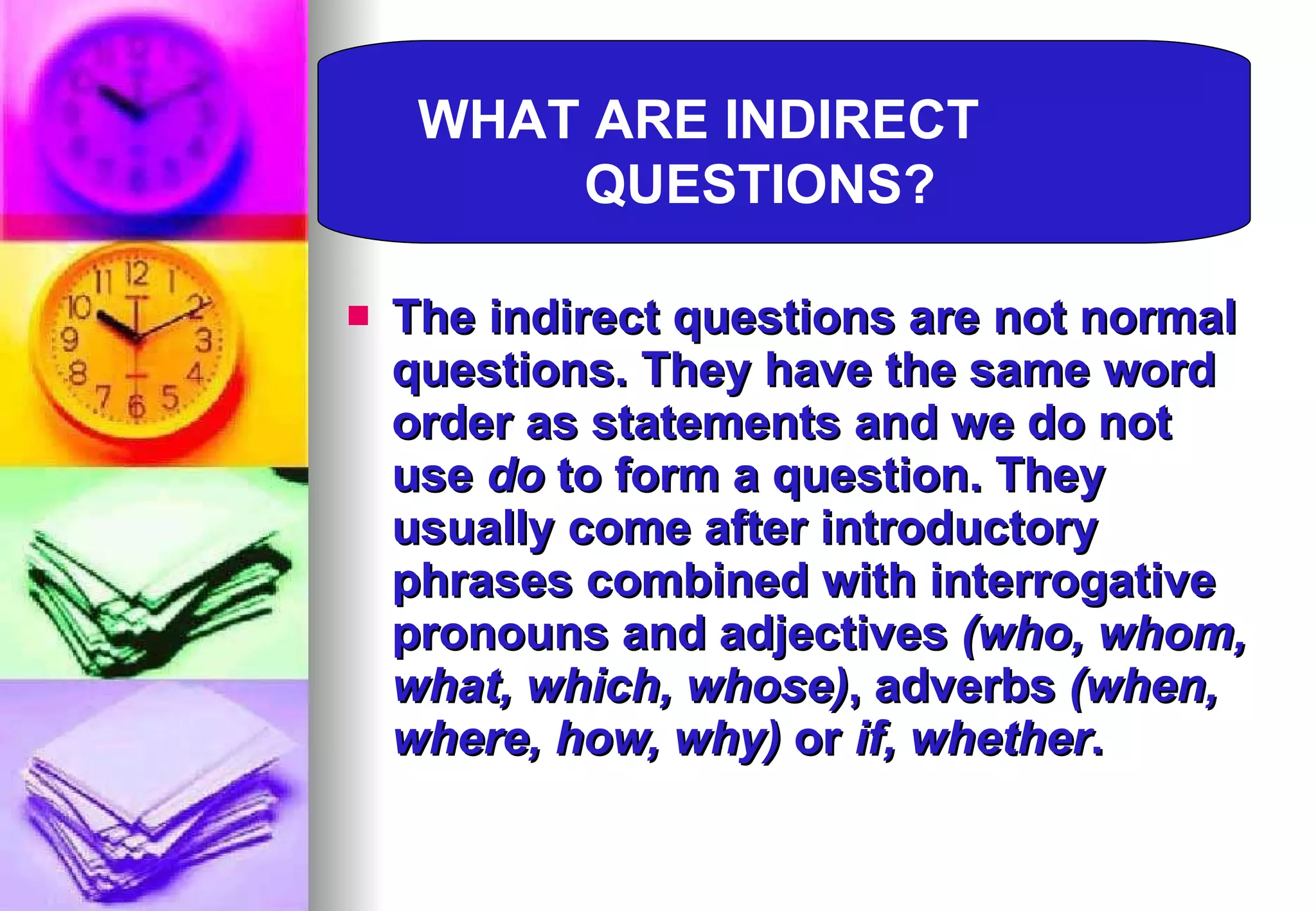 The document discusses indirect questions as a polite alternative to direct questions. Indirect questions have the same word order as statements and do not use "do" to form the question. They are preceded by polite requests like "Can you tell me..." or "Do you know..." asking for permission before posing the question. Indirect questions allow the person being questioned to choose whether to answer or not, making them more polite than direct questions when speaking to strangers or acquaintances. Examples are given of direct questions converted to indirect questions by adding a polite request before the question.