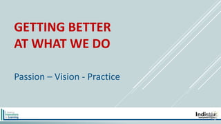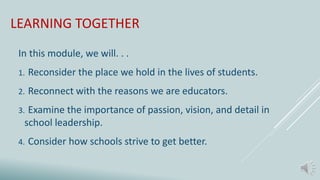 This document focuses on enhancing educational practices through reflection on passion, vision, and leadership in schools. It emphasizes the importance of shared leadership, collaboration, and attention to detail in achieving school improvement. The content encourages educators to reconnect with their motivations and consider the legacies they wish to leave behind.