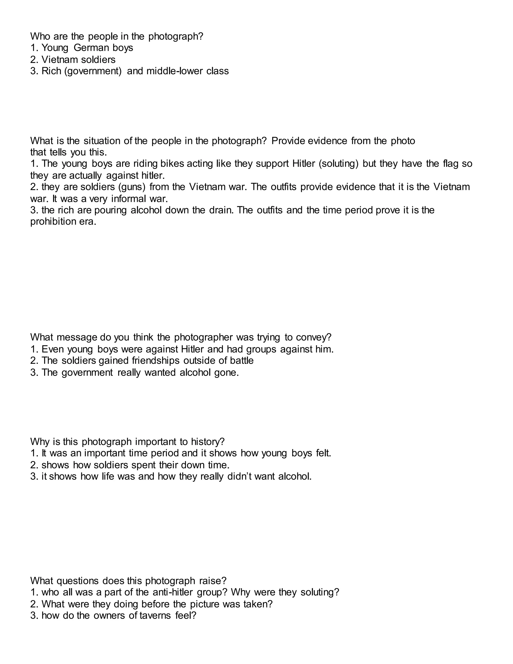 The document discusses analyzing an unseen photograph based on descriptions of possible subjects and contexts. Three potential scenarios are described: 1) Young German boys riding bikes and saluting, suggesting opposition to Hitler. 2) Vietnam war soldiers spending downtime together. 3) Rich government officials and middle/lower class citizens during Prohibition, with officials pouring out alcohol. The document asks questions about the photographer's intent, historical importance, questions raised, potential captions, ways to find more context, and inferences that could be made without seeing the photo.