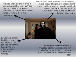 The document discusses the use of props in horror films to develop themes and build tension. Masked killers in films like Friday the 13th and Scream wear masks to hide their identity and instill fear in the audience. The blue tricycle ridden by Danny in The Shining signifies something bad is about to happen, and could represent Jack's psychological problems. Its unusual three wheels may symbolize the different sides to Jack's warped mind. Popcorn left cooking unattended in Scream builds tension as it rises, relating to the audience and foreshadowing Casey's inevitable death from her risky actions.