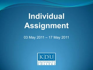 This document provides instructions for an individual assignment to write an 800-word essay about an organization the student wants to join. It specifies the timeframe of May 3-17 and includes pointers to research the organization's background, structure, and how the student's skills match the position and add value to the company. Students are asked to explain their interest in the specific organization and be selective in their job search.