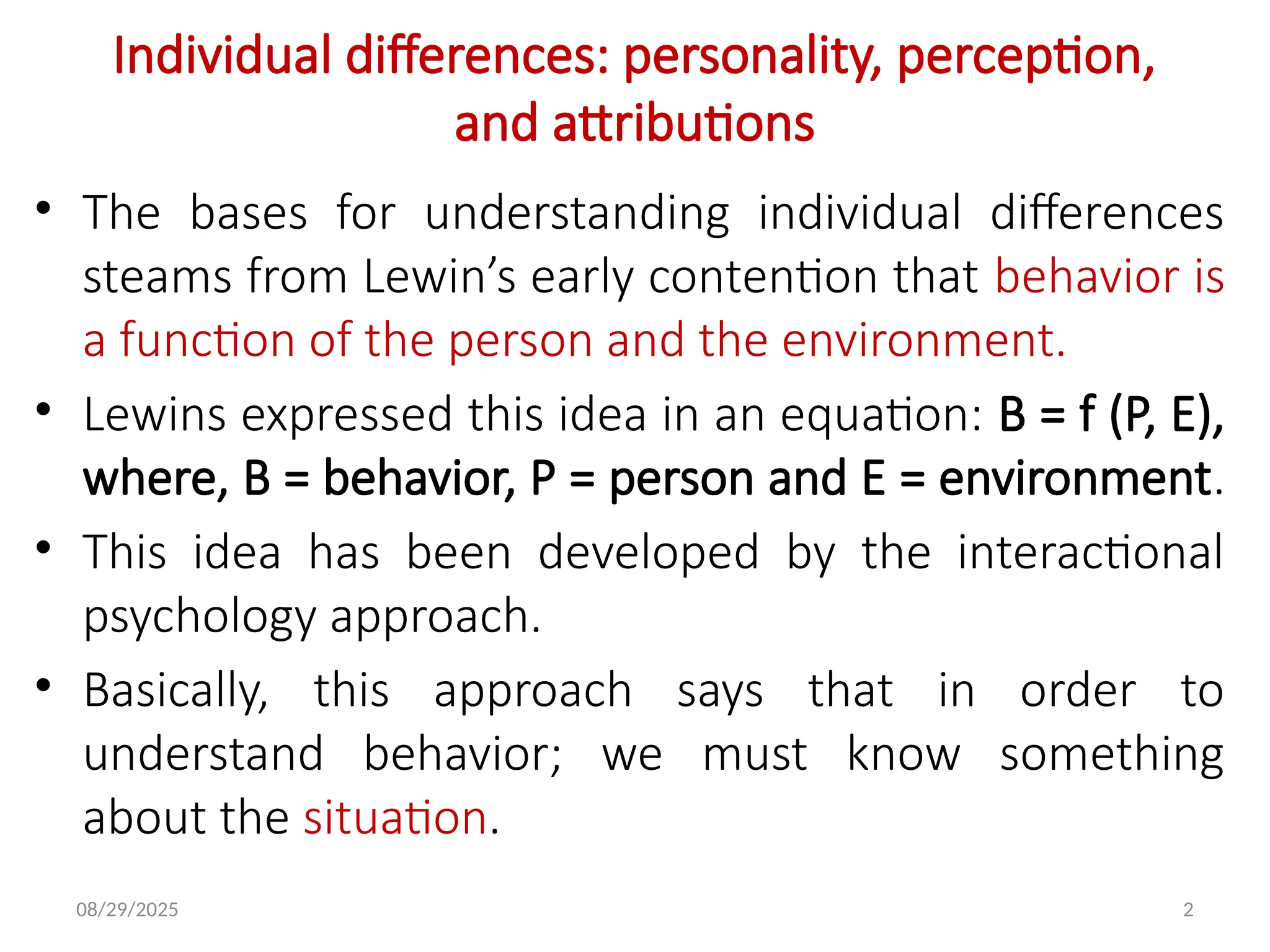 The situation consists of environment, the personal life situation, job characteristics, and many other environmental influences. One important and fascinating individual difference is personality.