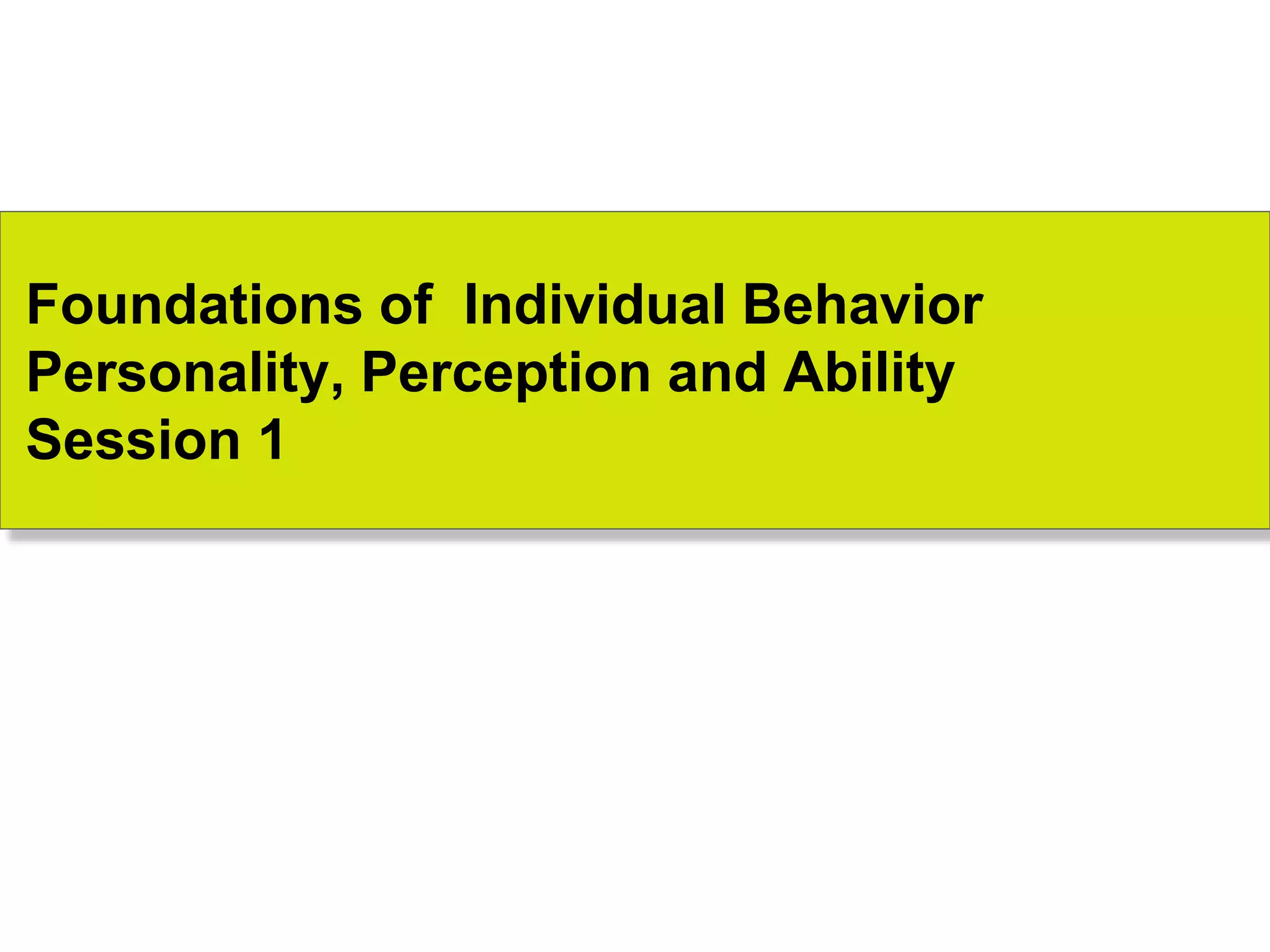 This document discusses 9 individual-level variables that can affect group performance and satisfaction: biographical characteristics, ability, learning, personality, emotional intelligence, assertiveness, perception, values, and attitude. It focuses on biographical characteristics like age, gender, and tenure; abilities including intellectual and physical abilities; and personality traits and types assessed by tests like the Myers-Briggs Type Indicator. Perception is defined as how people organize and interpret sensory information to understand their environment. The document also discusses biases and shortcuts that influence perceptions, like the fundamental attribution error.