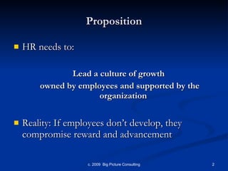 Individual development plans (IDPs) are often misunderstood and not effectively implemented. They are viewed as a list of training courses rather than a plan for developing capabilities needed for success. This leads to a lack of investment and perceived payoff. The document recommends reframing IDPs around developing skills needed for job success and tying them to career advancement. It suggests using a "business fitness" metaphor and making employees responsible for driving their own growth through relevant, accountable plans supported by supervisors.