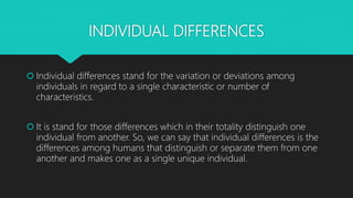 This document discusses a study on individual differences and attitudes. It defines individual differences as variations among people in certain characteristics that distinguish one person from another. The document outlines several types of individual differences including interests, attitudes, values, study habits, and psychomotor skills. Individual differences are caused by both hereditary/nature factors like intelligence as well as environmental/nurture factors like family and education. The document also defines attitudes as feelings or inclinations towards people and things, and discusses the cognitive, affective, and behavioral components of attitudes as well as their sources in family, peers, and socialization.