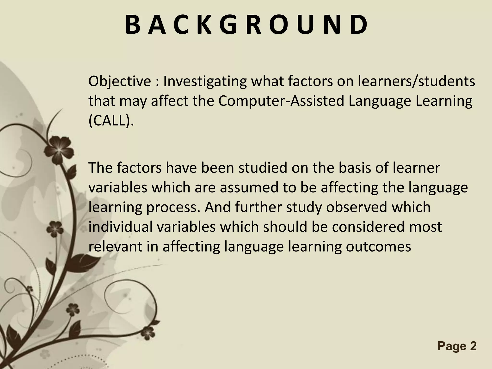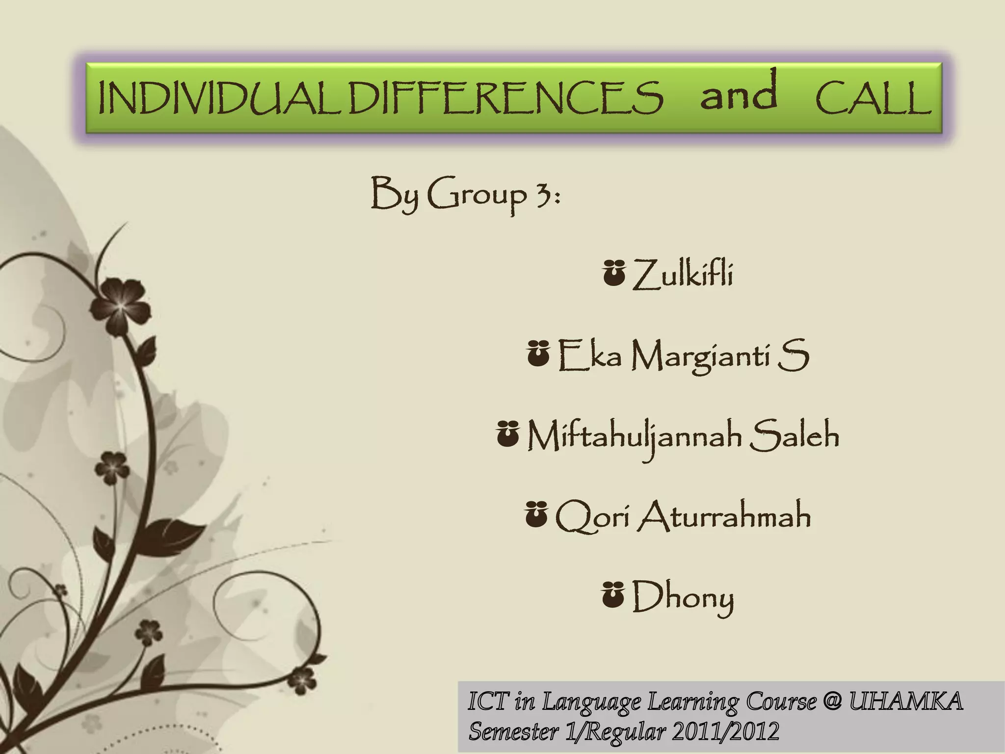 The document discusses several models that examine the relationship between individual differences and language learning. It summarizes models that view individual variables as independent factors affecting learning outcomes, as well as models that see the variables as interdependent. The models covered include the Good Language Learner model, Monitor Theory model, Brown and Fraser's framework, Levin's schematic model, Gardner's educational model, Skehan's model of influences, and Spolsky's model of second language learning. The document also lists several individual difference factors that may affect Computer-Assisted Language Learning outcomes.