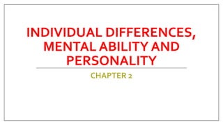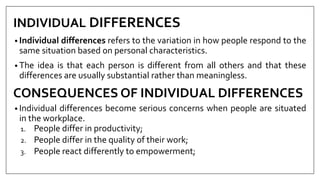 Individuals differ from one another in significant ways due to differences in demographics, aptitudes and abilities, and personality. Demographics like gender, age, and culture can influence individual differences. People also vary in their mental abilities like intelligence types and levels. Additionally, personality is shaped by both hereditary and environmental factors and influences traits like emotional stability, extraversion, and conscientiousness. These individual differences have important consequences in workplace settings with people performing varied productivity levels, work quality, and responses to leadership and empowerment. Effectively managing diversity requires understanding these differences between individuals.