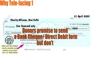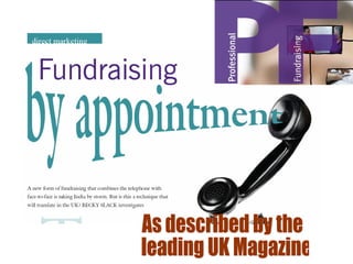 This document discusses various direct marketing techniques for raising funds from individuals, including direct mail, telephone fundraising, face-to-face fundraising, tele-facing, direct response advertising/TV, and new media such as email and websites. It provides examples of best practices for each technique, such as using lift letters and warm mailing lists for direct mail, calling residents during afternoons for telefundraising, and regularly orienting face-to-face fundraisers. The document also identifies potential pitfalls to avoid, such as reckless cold calling. It concludes by emphasizing that direct marketing can effectively unite donors and charities.