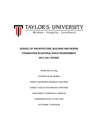 This document contains four journal entries by a student discussing concepts from social psychology. The first entry describes the student's mother disapproving of her boyfriend due to his educational and employment background, showing stereotyping. The second discusses how the student overcame doubts to achieve academic success, demonstrating self-efficacy. The third describes a classmate who is favored by teachers due to her intelligence but has a poor attitude, showing the halo effect. The fourth acknowledges the student's tendency to blame others to preserve their self-esteem, known as self-serving biases.