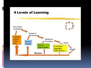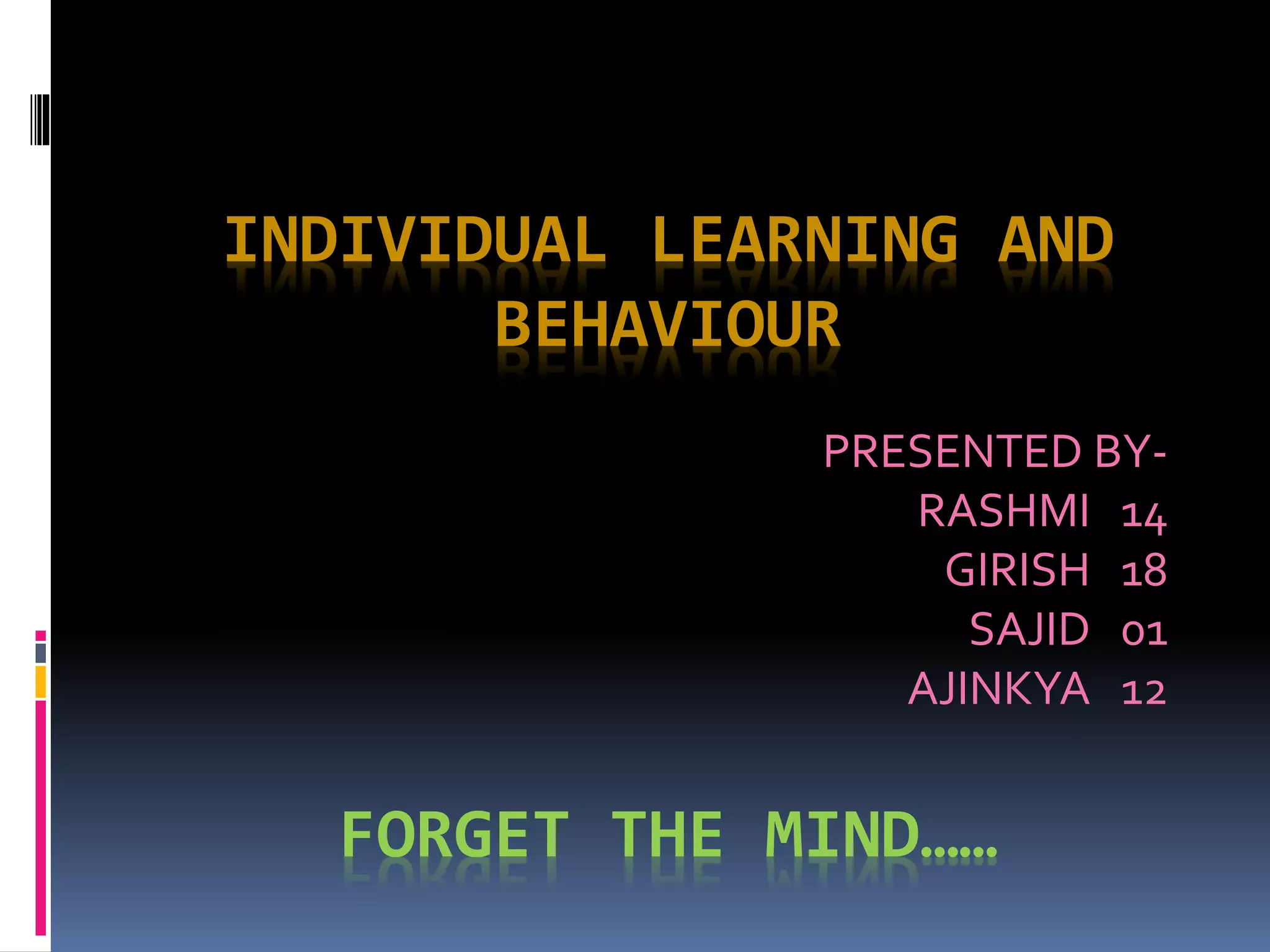 This document discusses individual learning and behavior. It provides an overview of learning theories including classical conditioning proposed by Ivan Pavlov, operant conditioning proposed by B.F. Skinner, and social learning. Classical conditioning involves relating two stimuli through experiments with dogs. Operant conditioning is based on modifying behavior through positive and negative consequences of actions. Social learning occurs through observing admired models such as parents, teachers, peers, and superiors. Learning is defined as a relatively permanent change in behavior resulting from experience.