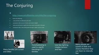 The document provides summaries of several horror movie tropes and conventions across 9 films. Key points discussed include the frequent isolation of characters in remote settings with little help, the targeting of female victims seen as the weaker sex, the use of masks by killers to hide their identity, and the employment of techniques like low lighting, fake blood and gore to create tension, fear and disturb audiences. Common narrative elements involve families being cursed or afflicted by diseases/entities and the struggle of victims to defend themselves without weapons in tense chase scenes.