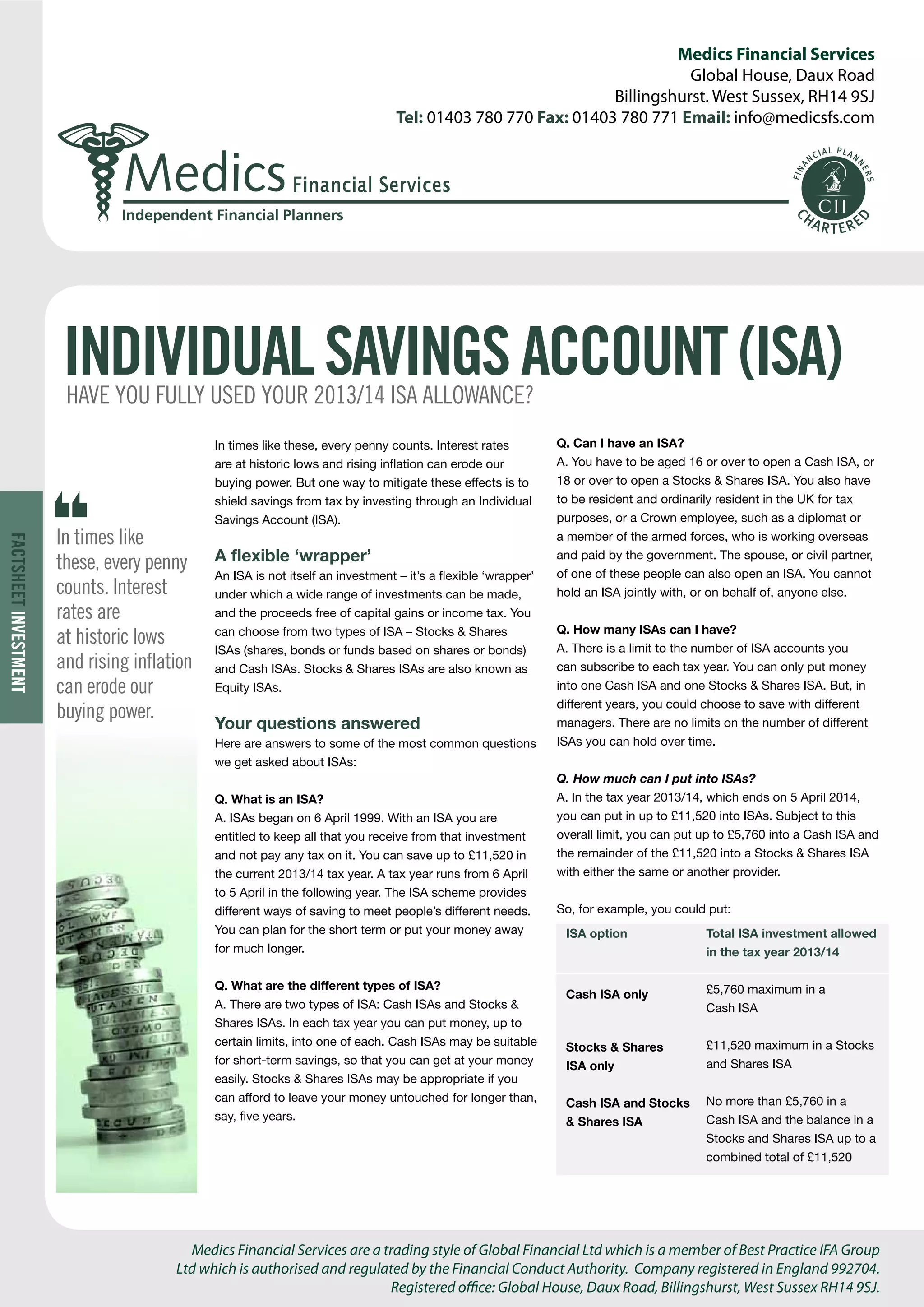 Medics Financial Services provides information on Individual Savings Accounts (ISAs), a tax-efficient means of saving that allows up to £11,520 to be sheltered from tax in the 2013/14 tax year. There are two types of ISAs: cash ISAs suitable for short-term savings and stocks & shares ISAs for longer-term investments. Tax benefits include no capital gains or income tax on earnings generated from ISAs, and junior ISAs allow contributions for children to build tax-efficient savings.