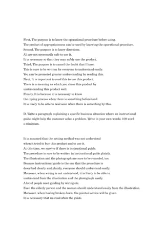 The document discusses the importance of instructional guides when selling products. It provides several reasons why instructional guides are important, including making the explanations comprehensible for customers and clarifying the operational procedures. The document also discusses writing major points in simple sentences with illustrations to make the information easily understandable. It explains reasons for studying the instructional manual before using a product, such as understanding operational procedures and directions. Finally, the document provides an example of how an instructional guide could help a customer solve a problem by clearly describing procedures and including illustrations.