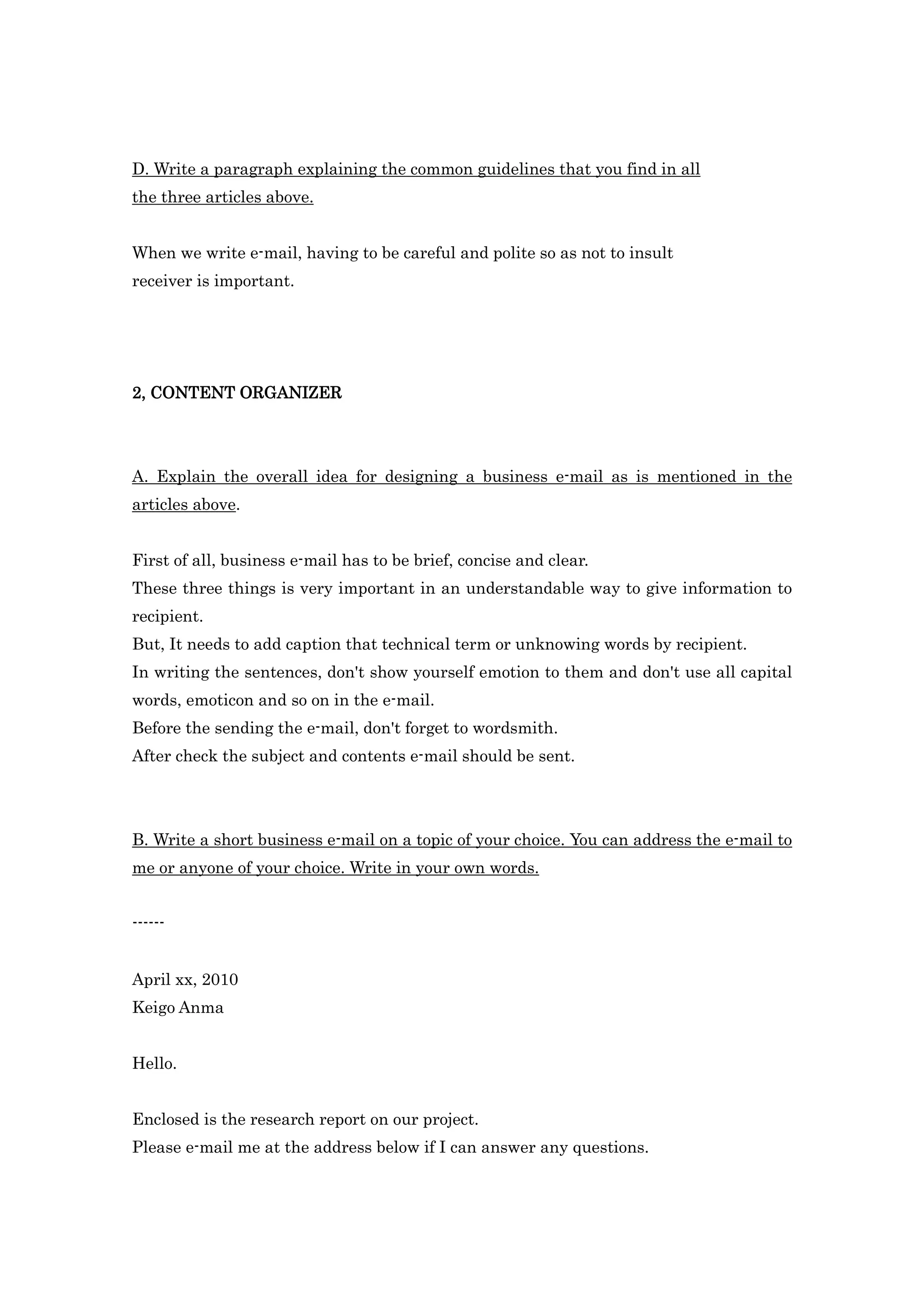 The document provides guidelines for writing effective business emails based on 3 articles. The key points are to write emails that are brief, concise and clear; consider the recipient; and check for understanding before sending. Common tips include thinking before writing, avoiding emotions or capital letters, and ensuring clarity without unnecessary words. Business emails should be more formal than personal emails.