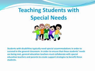 This document discusses strategies for meeting the needs of students with disabilities in the general classroom. It defines common terms like ADHD, IEPs, inclusion and assistive technology. It then provides examples of assistive technologies and non-technology supports that can help students with ADHD, auditory disabilities and mild learning disabilities participate and succeed in classroom activities. Sample assistive technologies include audio books, talking calculators and hearing assistive systems. Non-tech supports include seating arrangements, visual aids, graphic organizers and reading aloud.