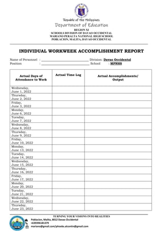The document is an individual workweek accomplishment report for an employee of the Mariano Peralta National High School in Davao Occidental, Philippines. It includes the employee's name, position, actual days of attendance and time logged at work from June 1 to June 30. However, the actual accomplishments and outputs for each date are blank, to be filled in at a later time. The report will be verified by the Secondary School Principal, Phoebe Christina S. Alcontin.