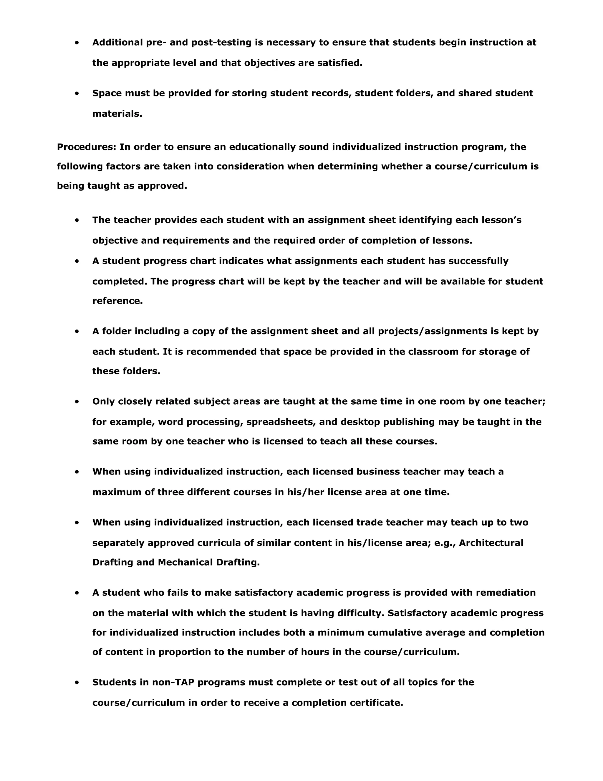Individualized instruction is a teaching method where students receive one-on-one instruction and self-paced learning based on progressive goals leading to course objectives. It allows students to work at their own pace and skip material they have mastered. However, it requires extensive record keeping by teachers and lesson plans that engage all students. Schools must ensure students are making satisfactory progress and receiving instruction from licensed teachers, not just using school facilities. Due to the intensive interaction needed, programs work best when new student starts are limited to no more than two per classroom per week.
