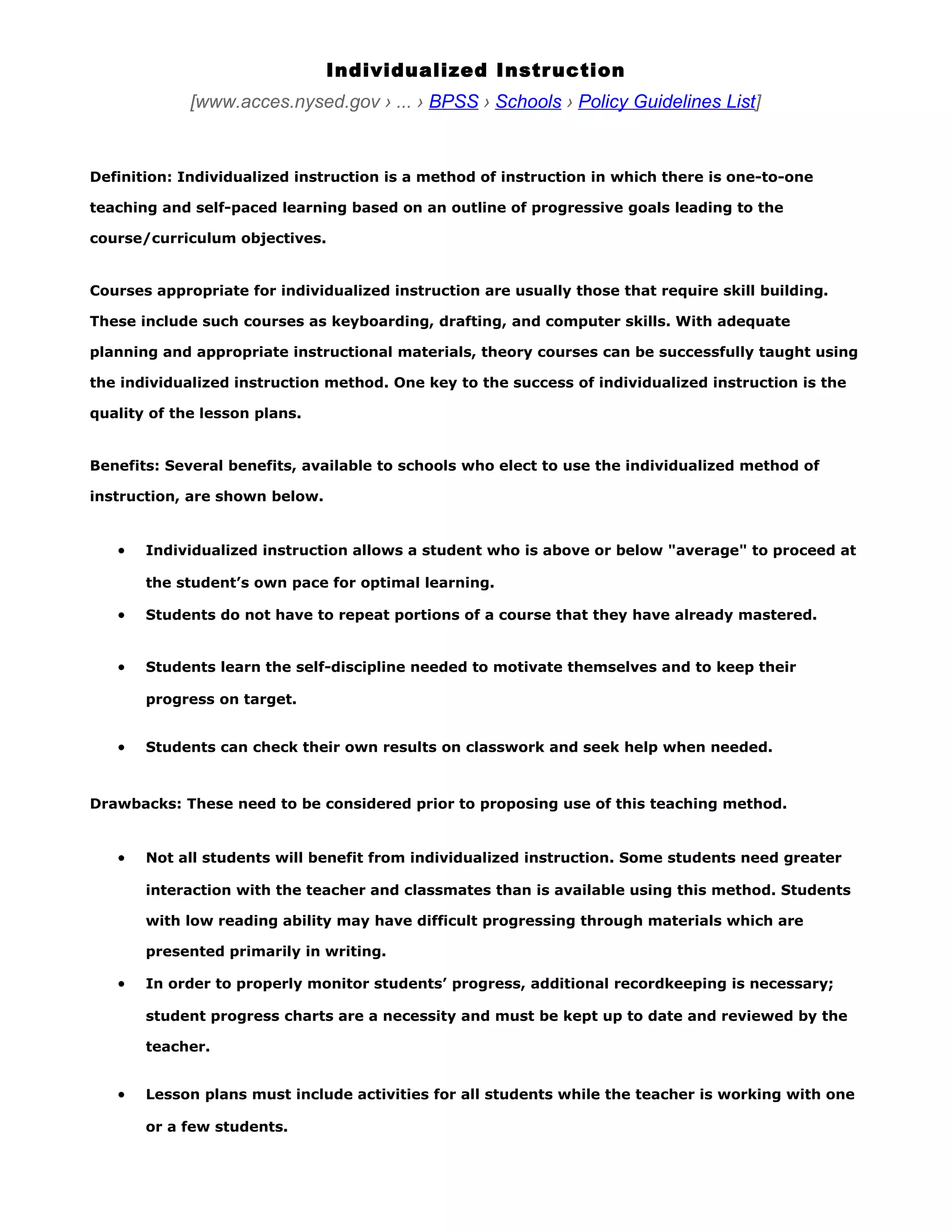 Individualized instruction is a teaching method where students receive one-on-one instruction and self-paced learning based on progressive goals leading to course objectives. It is well-suited for skill-building courses like keyboarding and drafting. Benefits include allowing students to work at their own pace, not repeating material, and learning self-discipline. Drawbacks are that not all students benefit, it requires extensive recordkeeping and lesson planning, and space is needed for student materials. Procedures to ensure a sound program include assignment sheets, progress charts, student folders, limiting unrelated subjects taught together, and limiting new student starts to two per week.