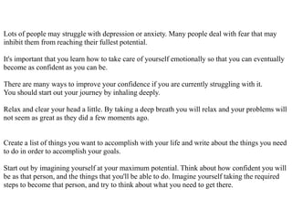 The document provides tips for improving confidence through natural means such as deep breathing, creating goals, exercise, sleep, and focusing on progress. It recommends making lists of goals and steps to achieve them, imagining your potential, and going at your own pace. Exercise, sleep, and focusing on positives are emphasized as important for building confidence over time through a process of self care and improvement.
