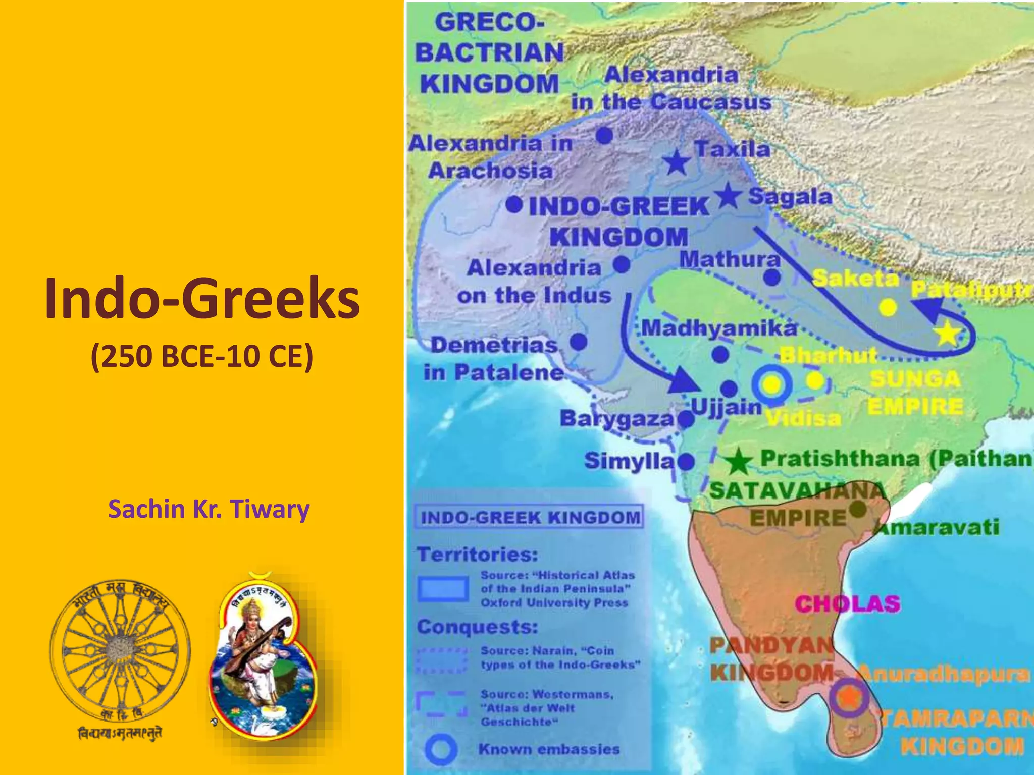 The document summarizes information about the Indo-Greeks who ruled parts of northern India and western South Asia from around 250 BCE to 10 CE. It discusses their dynasties and rulers such as the Euthydemids, Eucratides I, and Menander I. It also outlines sources that discuss the Indo-Greeks, including literary works, inscriptions, coins, and archaeological sites. The importance of the period is noted as the Indo-Greeks had political, economic, and cultural influences on India through interactions in areas like medical science, astrology, language, and art.