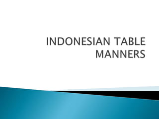 This document provides etiquette guidelines for eating, including using the right hand for eating and keeping the left hand at the side, not passing food with the left hand, waiting for the oldest man to start eating before beginning your own meal, not chewing and talking at the same time, putting aside disliked food on your own plate, men being served before women, using a spoon in the right hand and fork in the left when both are needed, and not eating while standing, lying down, walking, or burping during meals.