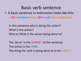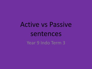 This document provides instruction on active and passive sentences in Indonesian. It explains that active sentences have the subject at the beginning and focus on the doer of the action, while passive sentences have the object at the beginning and focus on the thing being acted upon. Learners are provided example active and passive sentences and asked to practice writing their own, first in Indonesian and then in English. The purpose of learning passive sentences is also culturally explained.